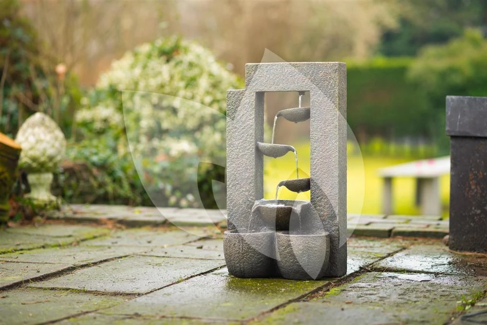 Modern en rustiek ontmoeten elkaar in dit mooie waterornament. In een strak vormgegeven kader loopt water via verschillende schaaltjes naar beneden. Vanuit het onderste schaaltje loopt het water het reservoir in waarna het weer omhoog gepompt zal worden. Een heerlijk rustgevend tafereel op uw terras!