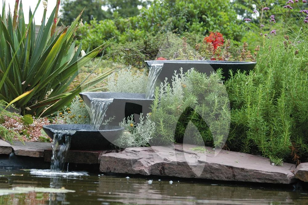 Het waterornament Nova Scotia is een set bestaande uit 3 watervalschalen. De schalen zijn gemaakt van het lichte materiaal terrazzo in een antraciete kleur. Dankzij zijn hoogwaardige kwaliteit heeft het ornament een lange levensduur verkregen. De schalen zijn verschillend van grootte en ieder voorzien van een uitsparing. Wanneer u de schalen boven elkaar plaatst zal er een waterval ontstaan, waarbij u kunt kiezen om de waterval te laten uitmonden in uw vijver of in een opvangbassin (deze wordt niet meegeleverd). De Nova Scotia wordt geleverd met een bijpassende pomp en aansluitmateriaal waardoor hij zeer eenvoudig is te monteren en te plaatsen.