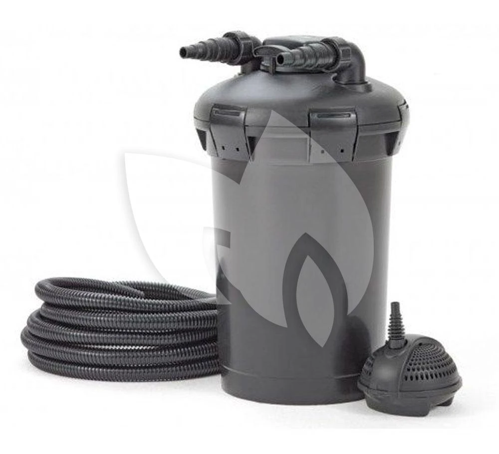 Drukfilter set 15000 bestaat uit een drukfilter PondoPress met geïntegreerd UVC en de daarop afgestemde filter- en beeklooppomp Pondomax Eco.