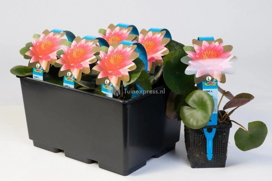 Wist u eerder dat er zoveel verschillende prachtige waterlelies te verkrijgen zijn? Neem dit roze exemplaar, een prachtige kleine bloem die zich onderscheidt met de verschillende roze tinten waarin hij bloeit. In welke fase van bloei deze bloem ook is, het blijft een plaatje om te zien. Met het gele hart steekt hij prachtig af bij het groen blad welke getekend is met paarse vlekken. U kunt zich blijven verwonderen over de schoonheid van deze waterlelie.